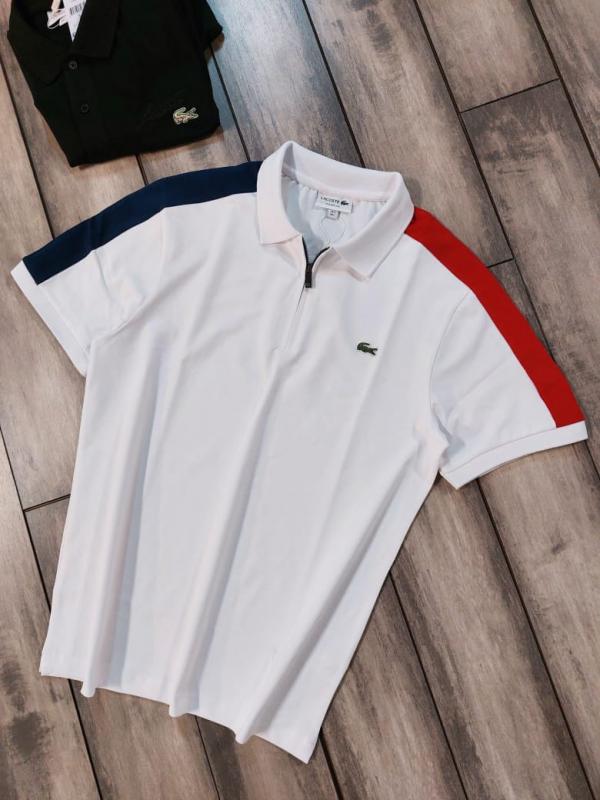 Lacost e White Premium Cotton Lycra Pique fabric Polo Tshirt with Shoulder Design and Embroidered Logo Zip Style 3388